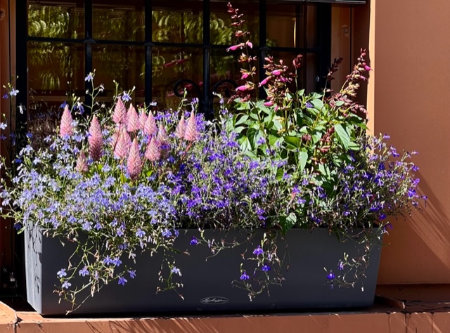 Vid alla fönster i den bruna väggen finns växter med färg, det piggar upp både inifrån och utifrån.