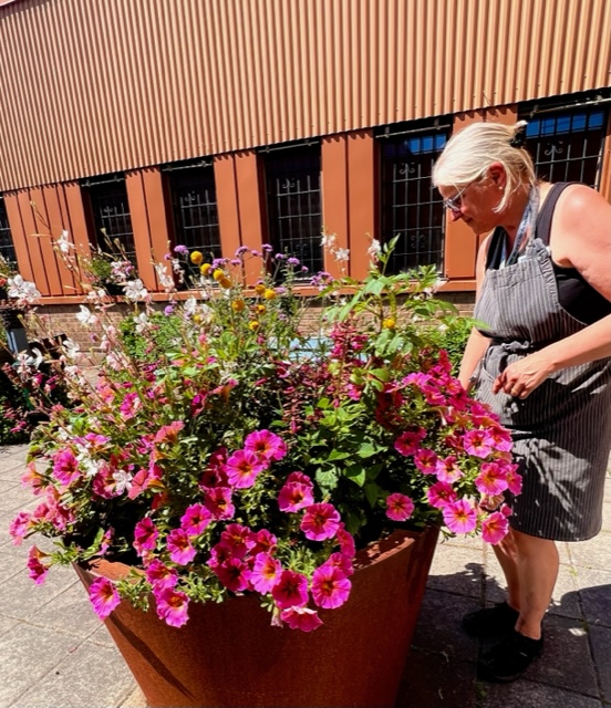 Karin sköter växterna, vattnar och planterar nya när något vissnar och ser till att det alltid är inspirerande att gå ut i trädgården med sitt lunchpaket eller sin kaffekopp och påfyllas av det blommande livet.. Det har konstaterats att personal som haft tillfälle att ta en rast i en trädgård, lättare klarar stress och går inte så ofta ”in i väggen”.
