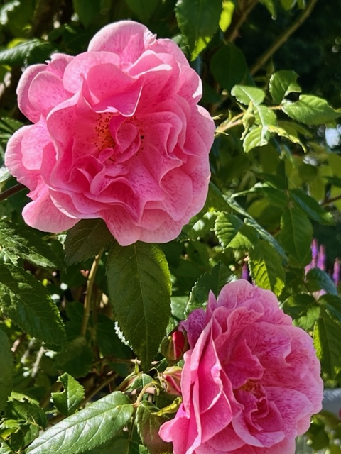 Rosengården med låga rabattrosor har råkat ut för steklar som ätit både grentoppar och rosknoppar i år, därför flammar de inte som vanligt ovanför det blå havet av lavendel och nepeta och hoppet står nu till andra blomningen något senare i sommar. Men bågen i slutet av rabatterna (eller början) är klädd med en frisk klätterros, Rosa Camelot, den har också blommor man vill ha nära.