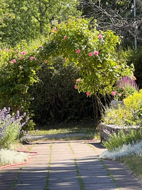 Mellan de beige och bruna huskropparna frodas blommande växter från våren och framåt och i den inre delen av trädgården visar just nu flera praktfulla stora rosor upp sin allra vackraste blomning. De flesta har funnits där i mer än 30 år .