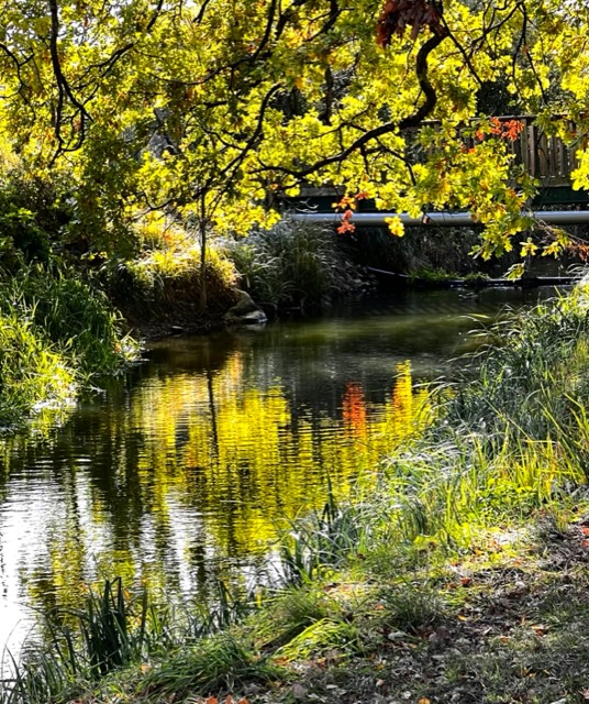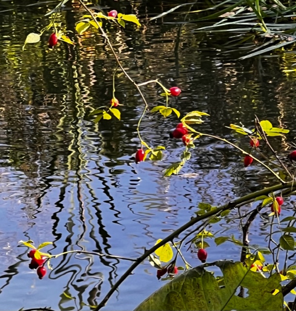 och det är mer vatten i ån än under sommaren. Junis blommande rosor har blivit blanka röda nypon och är det enda med färg förutom grönt som lyser upp utmed åkanten.