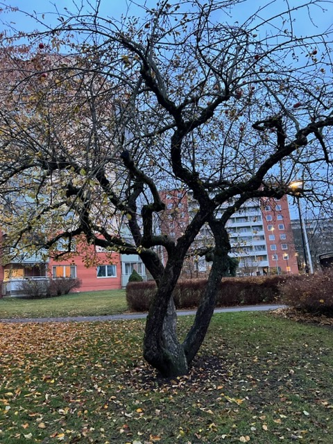 Äppelträdet med tre stammar avtecknar sig i skymningen och utgör ett levande konstverk. Träden visar hur de växt och svarat på människans ingrepp när stammarna är avklädda.