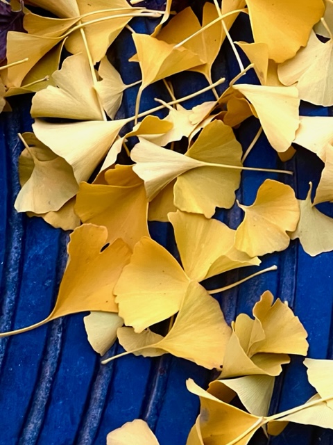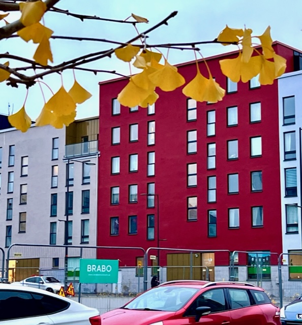 Jag har försökt hålla koll på de två lite kraftigare ginkgoträden utanför det nybyggda kvarteret, hur länge behåller den sina löv och kommer jag någonsin att få se deras gyllene kronor fylla luften framför huset, de växer oändligt långsamt. För en vecka sedan satt löv ännu kvar på grenarna.