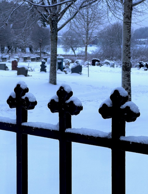 Den ståtliga Ornäsbjörken som vaktar ingången till vänster innanför grinden är fin även utan blad. Den nämns bland ett flertal Ornäsbjörkar som planterades när kyrkogården utvidgades.