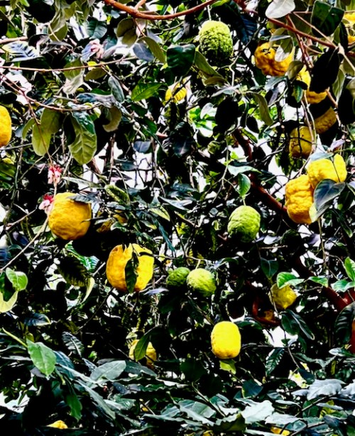 I nyttoväxtrummet har suckat-citronen stora gula frukter. När två sportovslediga småpojkar och jag stod och tittade på trädet hördes ett brak och två av de jättelika frukterna kom tumlande i luften och rullade ut på golvet. Första tanken efter alla stränga tillsägelser var kanske, vi rörde dem inte, de bara föll..