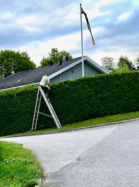 Sommarkväll, stilla och varmt, fåglarna är tysta och flyget går inte över oss. Jag går genom grannkvarteren, häckarna kring tomterna är nyklippta och regnet har gjort det gröna fräscht och fritt från damm. Det surrar lite någonstans och på håll ser jag en hög stege utmed en häck.