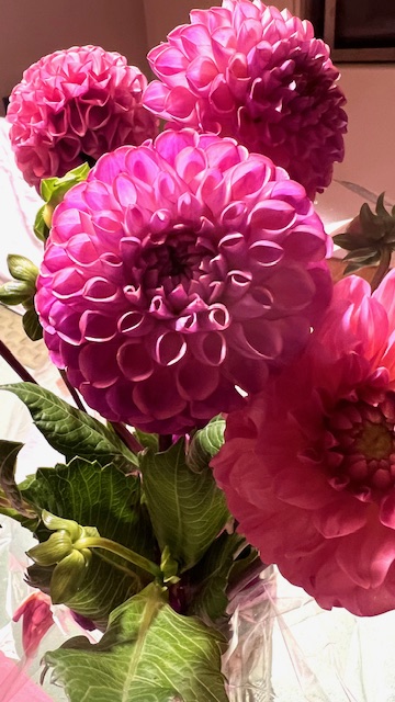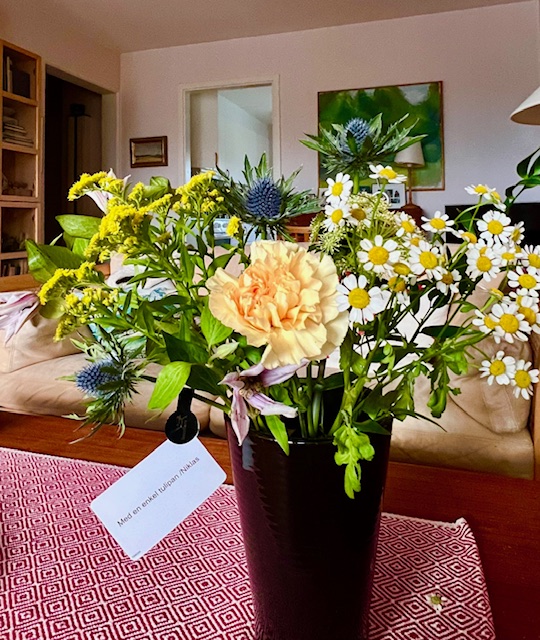 Dahliorna är läckra och har så många former och färger, här en födelsedagsbukett från Selina, vi fikade och firade en vacker lördag, Karin, tre barnbarn och jag. ”Småttingarna” är nu alla över 20 år och har valt vägar som ingen av oss gamlingar är riktigt hemma på och allt prat kändes nytt.