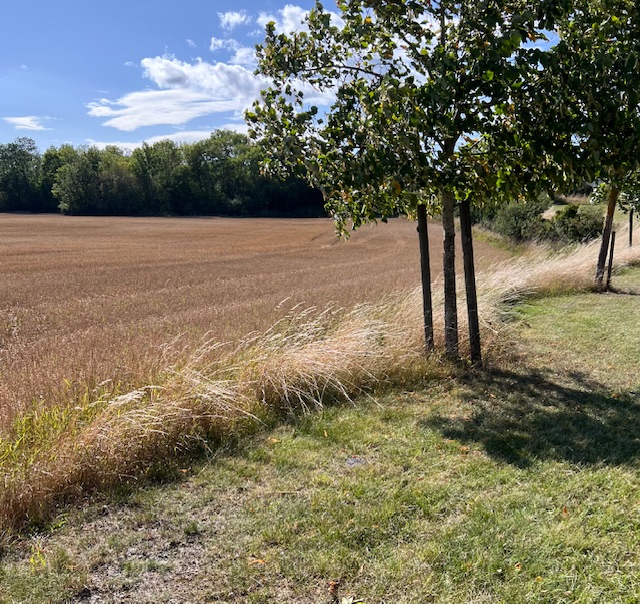 På fält och vägkanter är skördetid och utblommat gräs syns utmed åkrar och gångvägar. Vägen upp mot Runsa.