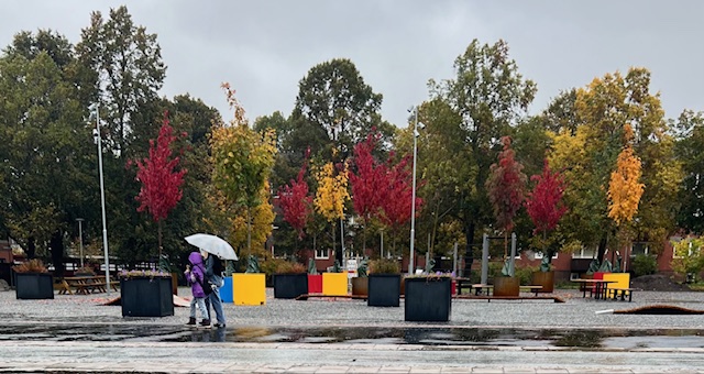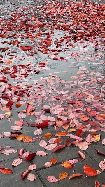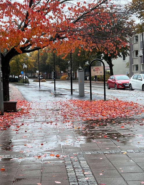 Regnet faller ojämnt över landet och här blir det numera sällan regn som strilar hela dagar i sträck och de gånger man kan se uppsända paraplyer på gatan (från mitt fönster) är lätt räknade. Men nu har det hänt, i ett par dagar regnade det utan uppehåll lugnt och ihärdigt och löven fick extra klar färg av vattnet