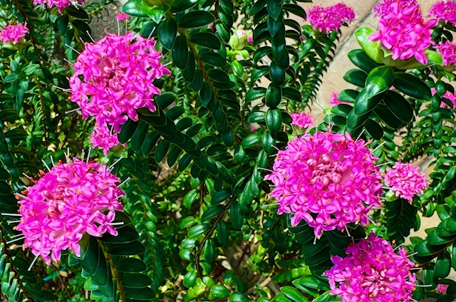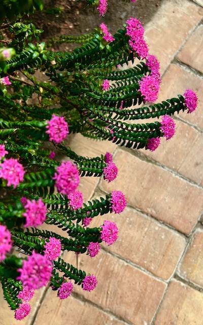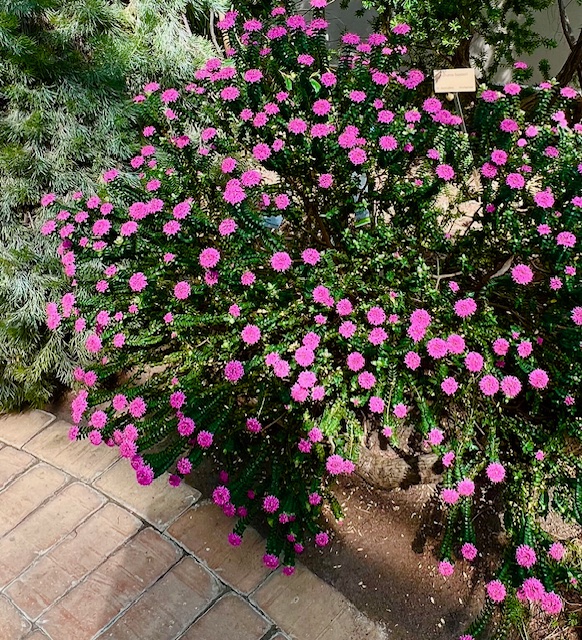 I växthusets australiska hörn blommar en jättetuva med röda blommor (Pimelea ferruginea) på engelska heter den Rice flower och Rosa risblomma är ett försök att försvenska den.