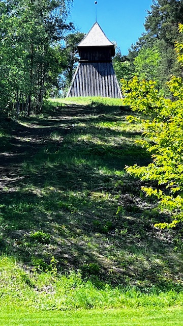 Klockstapeln från 1600-talet och klockbacken vid Hammarby kyrka.