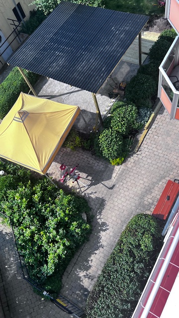 16 juli. Tittar ner på gården och ser att en äldre snickare med smörgåspaket och vattenflaska vilar i värmen efter att ha satt upp ett tak som täcker husets innevånare och när regnet närmar sig kommer ännu ett tak upp.