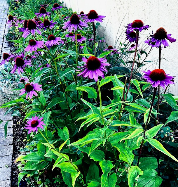 Rödhattarna utmed garageväggen lyser i härligt rödviolett.