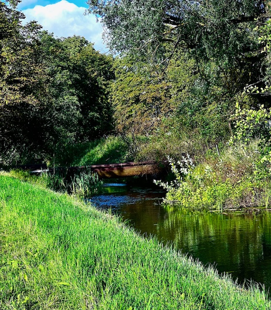 Åns raksträcka söderut rör sig sakta och vattnet är klart, man ser bottnen och ovanligt många änder håller till utmed kanterna. Inga höstfärger har ännu letat sig in i grönskan.