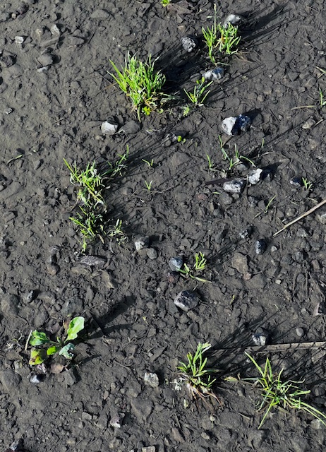 Regnen som kommit har blivit kvar i pölar som inte hinner torka upp mellan skurarna och där i gruset gror gräset lysande ärtgrönt på vägen.