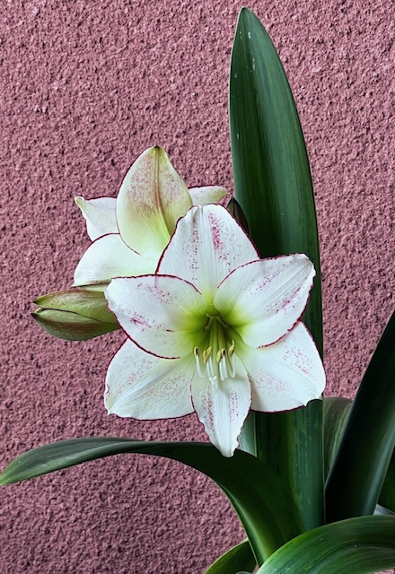 Och hemma på balkongen väntar en blommande Amaryllis, jag sparade två lökar från julblomningen för att se om jag klarade att sköta dem till nästa jul. En av dem ville inte vänta och lyser nu upp bland semestrande grönt.