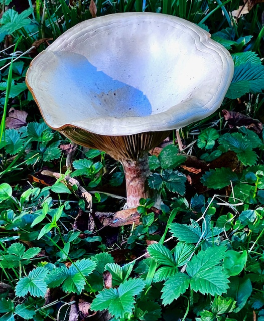 Mycket få svampar syns i gräset under lindarna och inga alls i gruset.