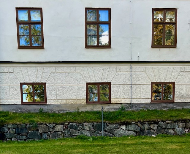 Går utmed slottets sida, kavaljersflygeln med fönster som speglar himmel och park.