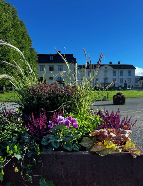 Blomsterlådorna som möter vid entrén är nu höstplanterade.