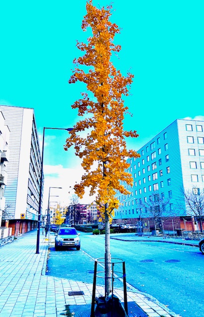 Jag har väntat på att Ginkgon lite längre ner på vår gata skulle guldfärga sina löv och sedan förgylla trottoaren och rännstenen och nu har det hänt.