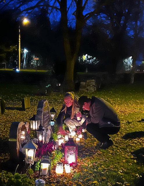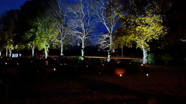 Allhelgonadagen på Eds kyrkogård. De upplysta gamla lindarna utmed trafikleden har kvar en del löv. Det är helt mörkt så när som på gravlyktorna och lindarna och klockan är en kvart i fem.