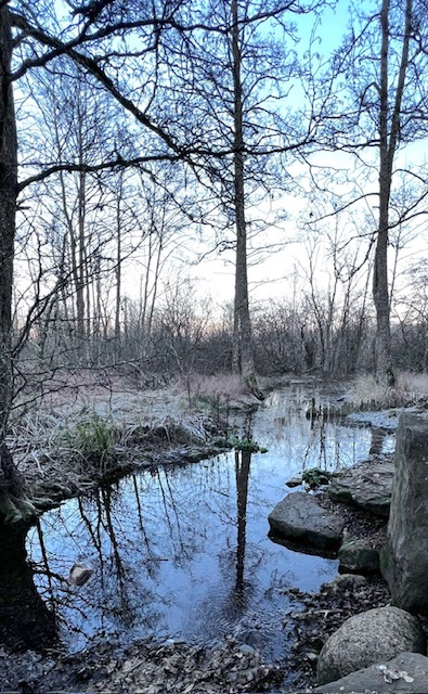 Den mörka och regniga senhösten har fyllt på det gamla vattendraget Väsbyån med ett envist småregnande och omgivningarna avspeglar sig förföriskt i den stigande vattenytan. Men dagarna är korta, det gäller att vara ute före klockan 14.30 för att få syn på vattenytorna. När jag vaknat lite sent på mornarna, klätt mig och ätit och grejat med något som behöver göras, har det redan börjat skymma och om jag då går handlar mat så är det mörkt när jag kommer ut ur affären.