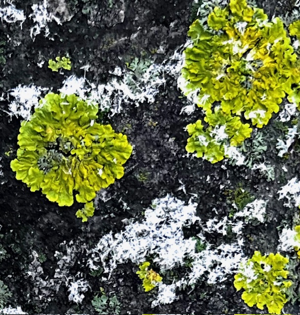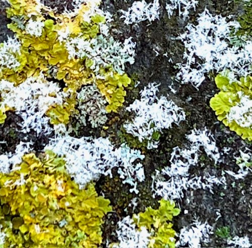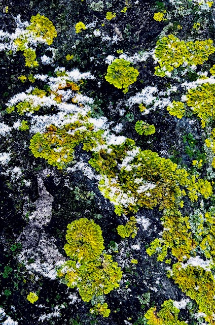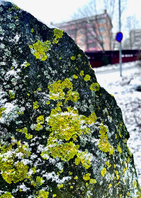 Stenen med de gula lavarna står vid en av stigarna in till Elisparken i Upplands Väsby, jag har försökt hitta namnet på lavarna och det närmaste jag kommer är vägglav (Xanthoria). Den är klargul och sitter tätt mot stenen och jag läser att den förekommer på trädstammar och väggar förutom sten och havsklippor och den är vanlig i hela Sverige utom längst i norr.