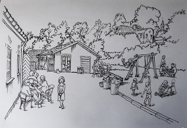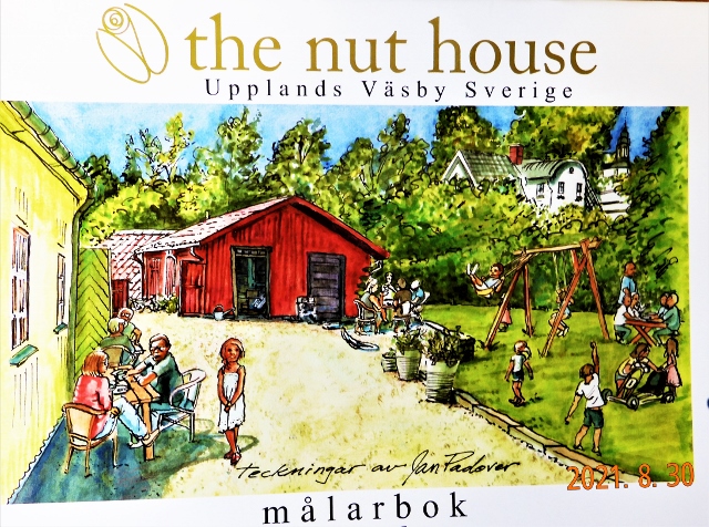 Konstnären Jan Padover har ritat tolv bilder från sin vistelse här i trädgården som kan färgläggas fritt, bara omslagsbilden har färgförslag.