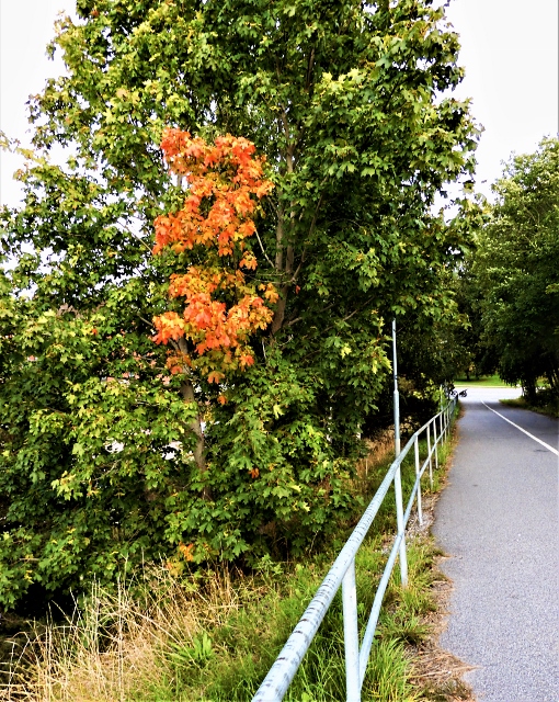 Vid brofästet mot Väsby flammar ett par lönngrenar upp som eldslågor ur det gröna.