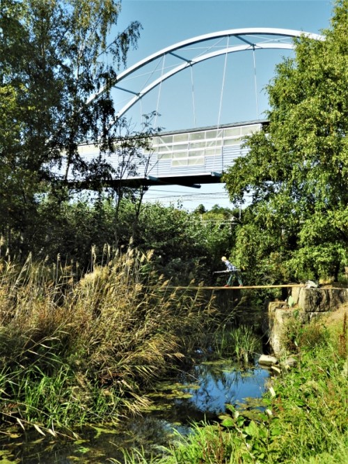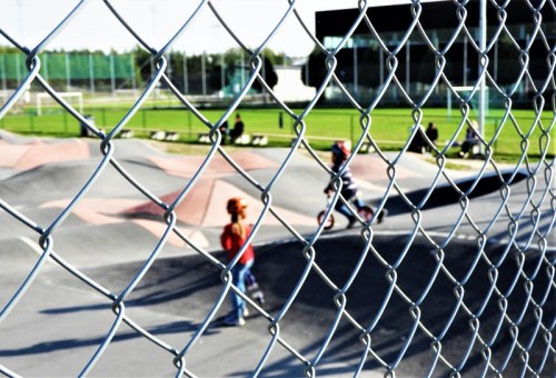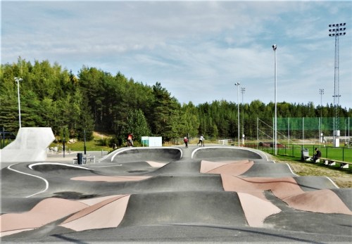Då jag sneglar mot simhallen ser jag att det har tillkommit nya attraktioner bland idrottsfälten , barn av blandade storlekar åker med cyklar och sparkcyklar på banor med gupp och när jag försöker fånga dem med kameran fastnar de inte, det går för fort och de är för små.