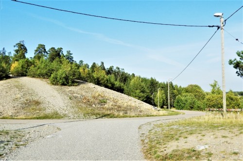 Här uppe delar sig gångvägen, den till vänster leder ner igen och ut ur skogen, att gå uppför grusbranten mellan de två asfalterade vägarna kändes motigt, så jag prövade den högra vägen. Den visade sig gå genom skog men på måttlig höjd och gav ljudkontakt med E4 som följer åsen och jag kunde se mellan träden att åsen höjde sig kraftigt till vänster om mig, jag skulle nog valt att ta grusvägen mellan de två, men det rullade bra på asfalten så jag fortsatte.
