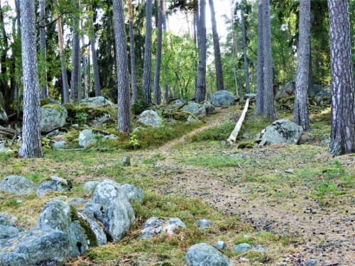 Några sköna dagar i september, milda vindfläktar och jag siktade på att äntligen leta upp de märkliga stenformationerna som Lasse och jag råkade se på åsen i Apoteksskogen, då vi gick hem från Ingegerd i Skälby en gång för 13 år sedan.