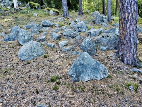 Solen började skymmas av träden och skuggorna blev långa. Jag har inte hittat någon text som beskriver de här stensamlingarna. Är det möjligen den Hammare som givit namn åt platsen? Ungefär som de stora blocken vid Linnés Hammarby? Stenarna ser ut som om de ordnats i äldre järnålder. Då var åsen fortfarande en lång ö som stack upp över vattenytan. När man beskriver landskap från forntiden är det ofta den odlade, bebyggda och inhägnade marken man ägnar sig åt men stenamlingar i skogen nämns inte i det sammanhanget. Grusåsar har hyst många gravar från äldre tid och och jag undrar om inte den här anhopningen av sten har räddat den här delen av åsen från att urholkas.