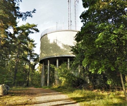 Och högst uppe i blåbärsriset finns ett vattentorn ! Hittar inte en rad om det bland sevärdheter i Väsby. Skånska vattentornsällskapet som fotograferat vattentorn i -Sverige har en bild men säger inte när det byggdes eller togs ur bruk. Kan tro att det är från tiden då vatten hämtades i åsen, då vi kom till Väsby på 60-talet togs vatten ur åsen, det var mycket hårt och krävde extra tvättmedel. Nu får vi Mälarvatten och det är annorlunda.