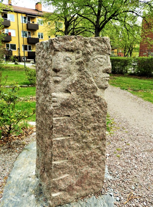 Jag kände på dörrarna till skolan för jag ville visa Bo Beskows fresk på vägen mot aulan för de yngre, men dörrarna var förstås låsta. Sen gick vi ut på baksidan av skolan där den forna gropen nu är en utfylld grässlätt med flera stigar upp mot parkens höjder, som egentligen består av en mängd kala bergknallar med gröna sänkor emellan. Sedan jag läst Vivi Horns bok, Roslagstull, vet jag numera vilka som byggde och bodde i de olika byggnaderna och när och jag pladdrade i ett och pekade. Där var det och där var det och där uppe var duvslaget som förblev ett hemligt område, när Birgitta och jag var ute och spejade….o.s.v.