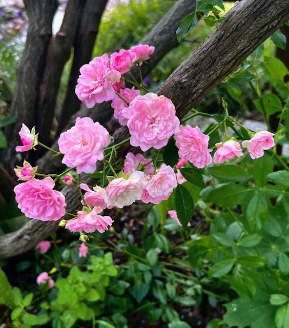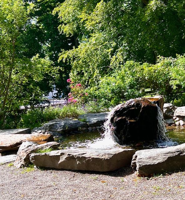 Källan som pumpar vatten till Suseboparkens strömfåra ger parken liv och vattenbrus. Man följer gärna strömmen nedåt, men om man vänder sig åt andra hålet står man i rosenträdgården. Den lilla Fairyn finns gömt under grenarna längst till vänster på bilden. Den röda småblommiga som nu syns från hela parken och som jag jämförde med en morsdagsros, har lämnar krukstorleken och tävlar i höjd med de stora buskarna.