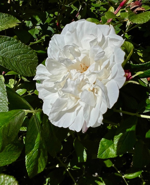 Den vita rosen som blommade tidigt och med den sagolika doften, blommar om, inte ymnigt men varje blomma ger doft åt hela busken. Vad kan den heta? Jag tror, efter att ha jämfört bilder att den heter, Rosa (Rugosa) Blanc Double de Coubert.