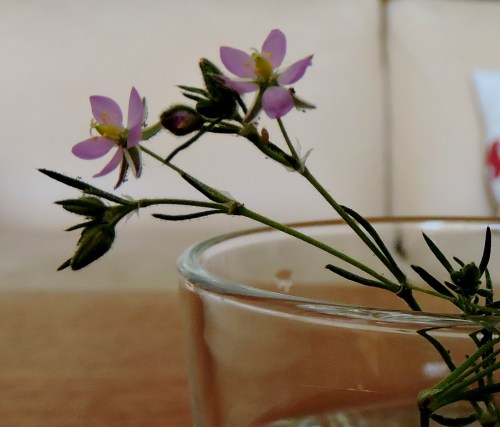 Kul att få examinera på gammalt vis. Blad nästan trådsmala, blad motsatta med hinnaktiga stipler…….Spergularia rubra – Rödnarv. Nej den har jag inte blivit bekant med förr, det var de rosa(lila) blommorna som gjorde att jag såg den.
