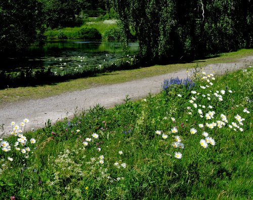 Här ser man stigen utmed Bergianska trädgården, där vi gått många gånger utan att veta om stigen på andra sidan vattnet i Tivoliparken.