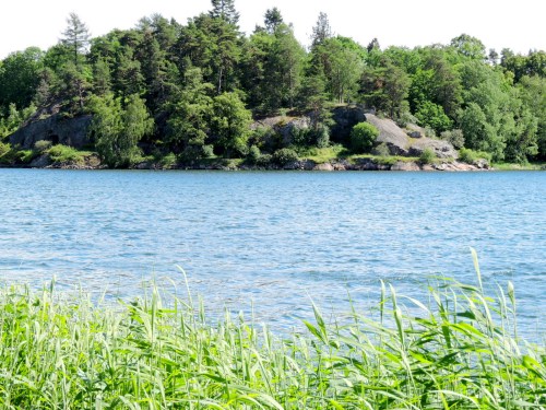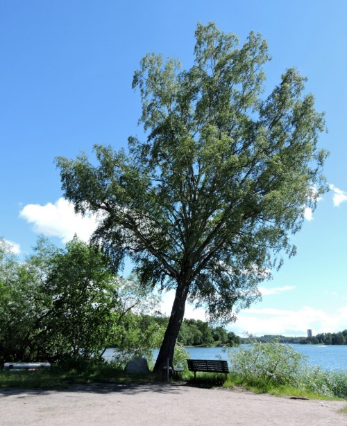 Efter att ha gått igenom koloniområdet skymtar jag vatten och enorma träd, höga och breda. Solen gassar och vinden är häftig. Vid Tivoli brygga står en jättebjörk och härifrån ser man över till Haga och Bergianska. Då jag kollar om björken går in på bild ser jag en kungsörn som seglar runt och håller mej under uppsikt men solen bländar både mej och kameran, så den lyckas jag inte fånga.