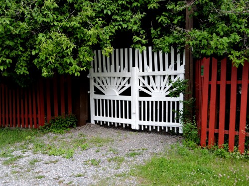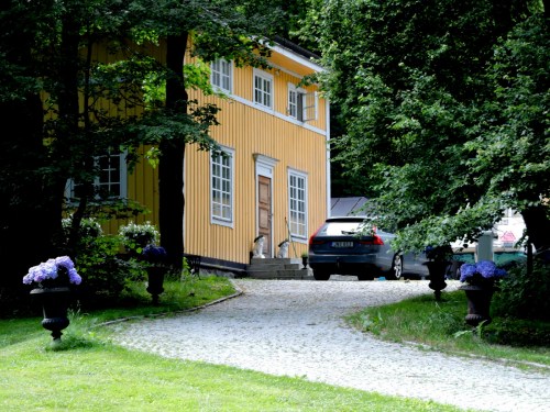 Jag sliter mej från höjden och går ner bland husen på den lägre sidan, vänder mej om, där är kastellet igen (numera festvåning. Här nere finns något som liknar gator, barngungor (dagis?), parkeringsplatser och gårdar med de största och vackraste rosor jag sett på länge, dessutom i ovanliga färger. Alla hus har namn efter vad de använts till en gång, Kolskjulet, Flaggkonstapelbostället , Hantverksbostället men allt är uthyrt till helt andra verksamheter av Statens fastighetsverk.