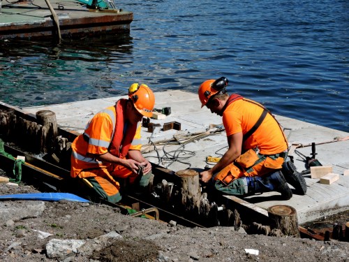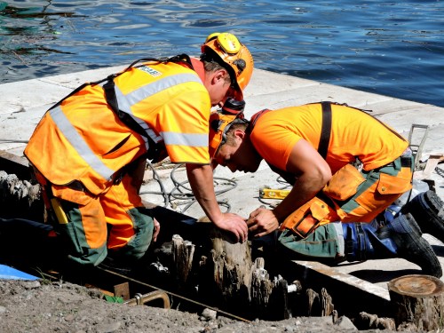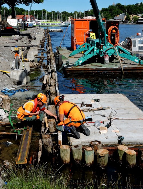 Strax före bron över till Kastellholmen pågick arbete med att byta ut trä som slitits ner troligen runt hela Skeppsholmen och det såg knepigt ut.